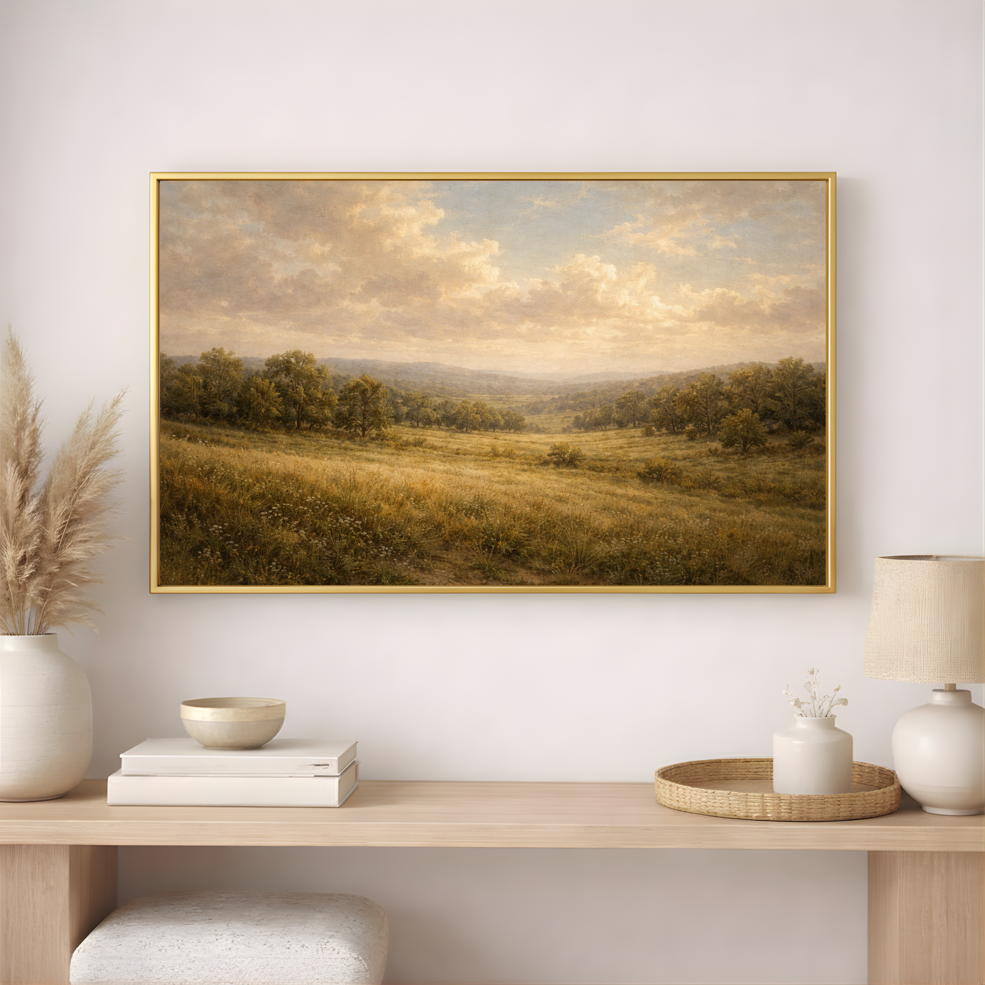 Inspired by classical European landscape painting, the artwork features rich painterly textures, soft atmospheric light, and warm earth tones that create a timeless and calming presence.