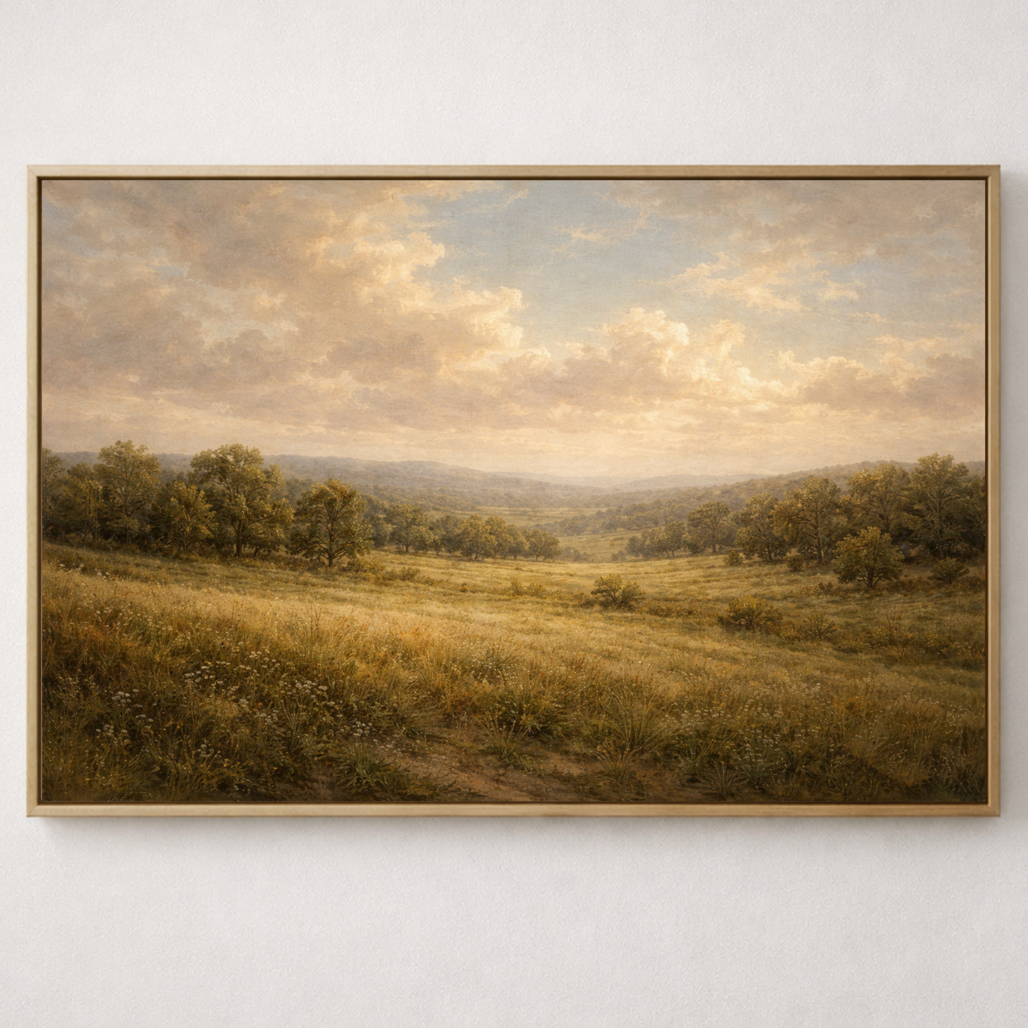 Soft golden light stretches across a peaceful countryside meadow in this timeless classical landscape painting. Rolling fields of wild grasses and delicate meadow flowers sweep across the foreground, leading the eye toward distant hills and scattered trees fading gently into atmospheric haze.