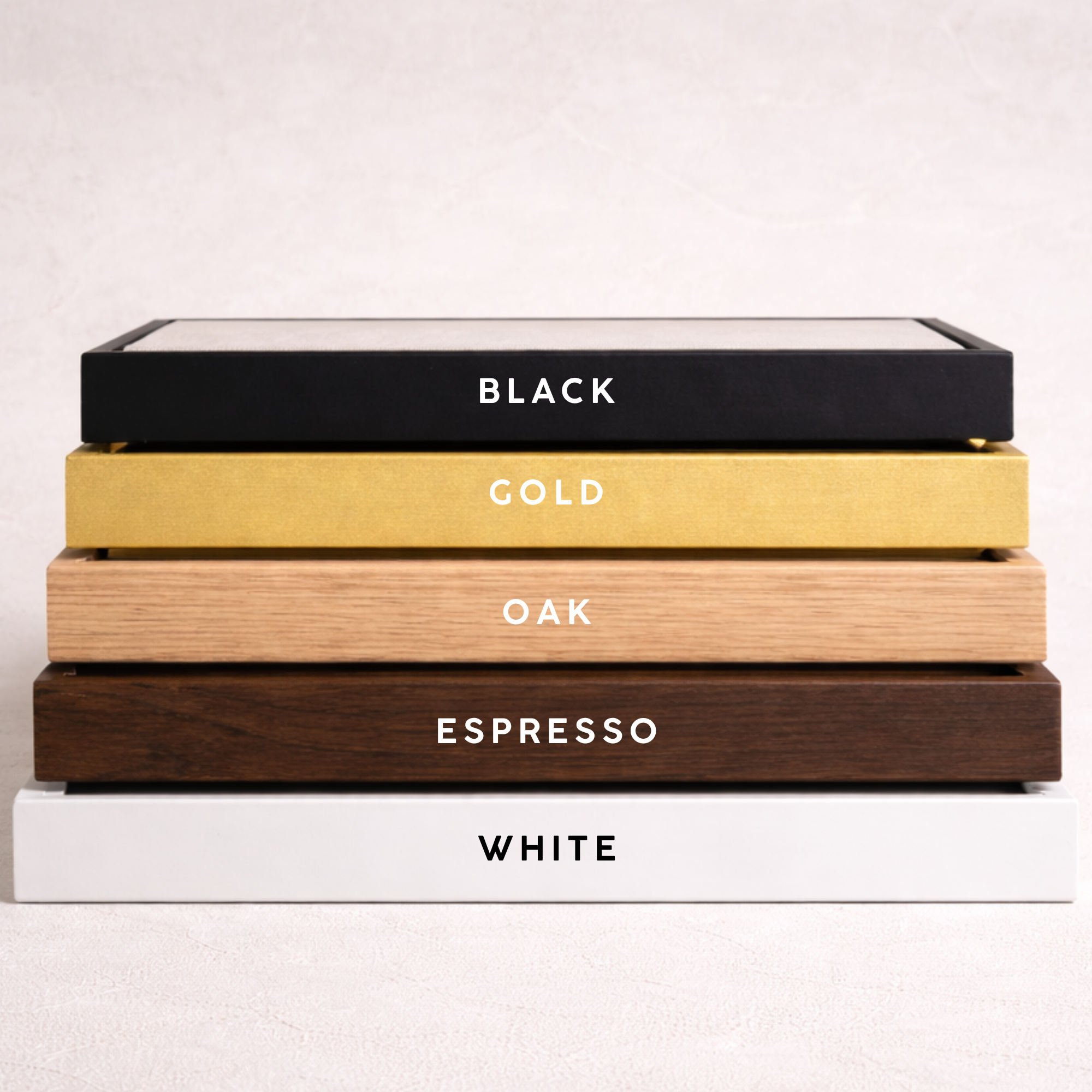 • Floating frame in light wood, black, or white