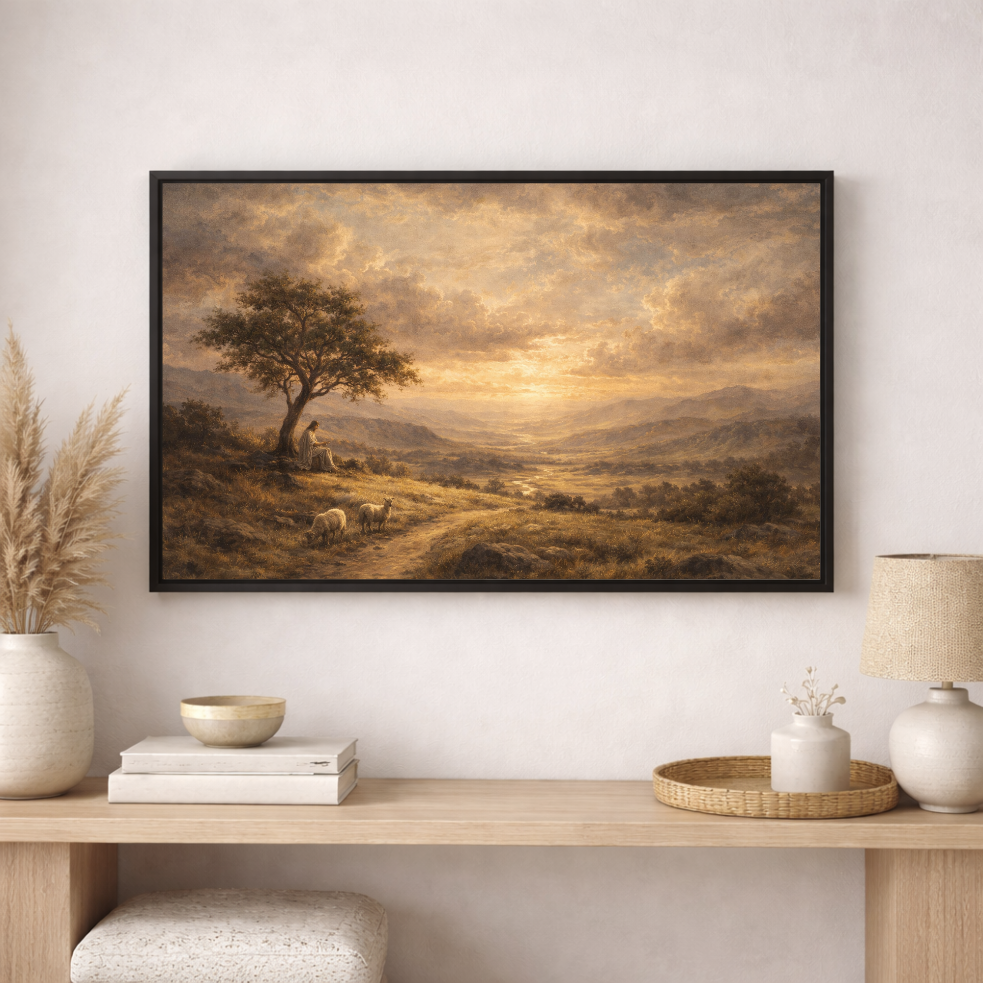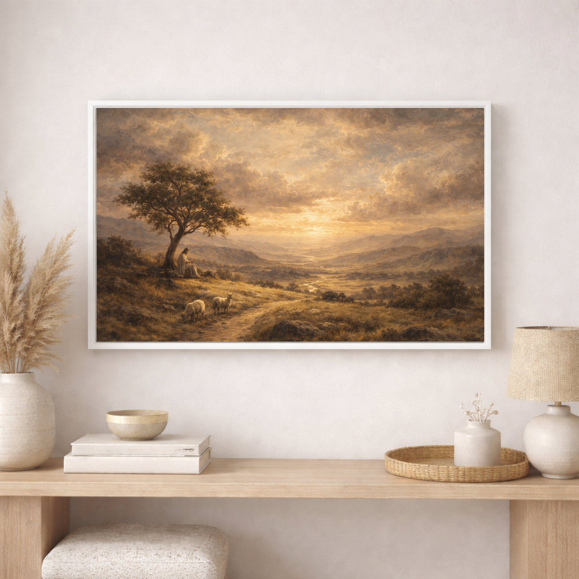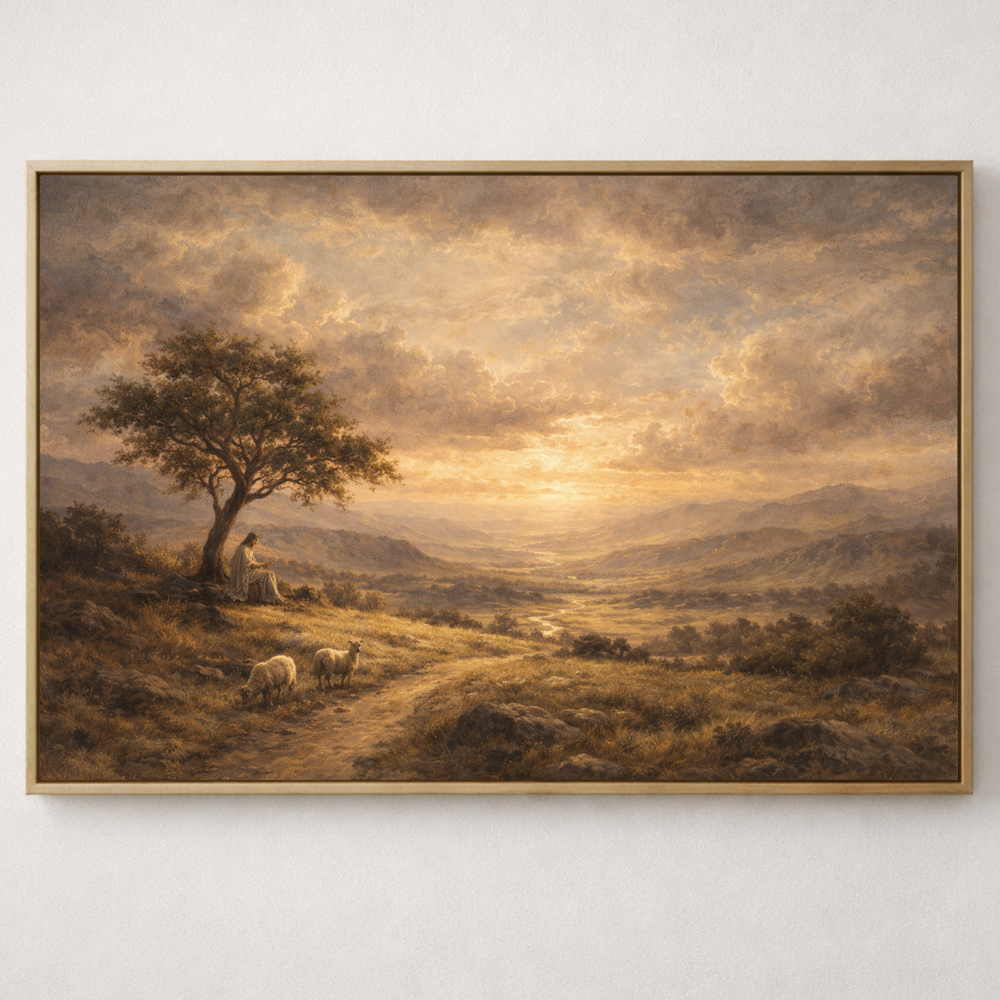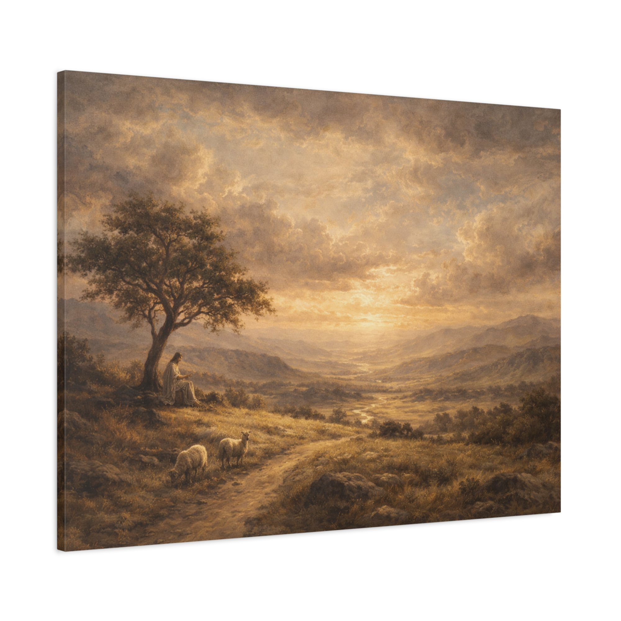 This beautiful Christian landscape artwork captures a peaceful moment of reflection as Jesus sits beneath a tree overlooking a vast valley at sunset. A gentle path winds through golden fields while sheep graze quietly nearby, symbolizing the comforting presence of Christ as the Good Shepherd.