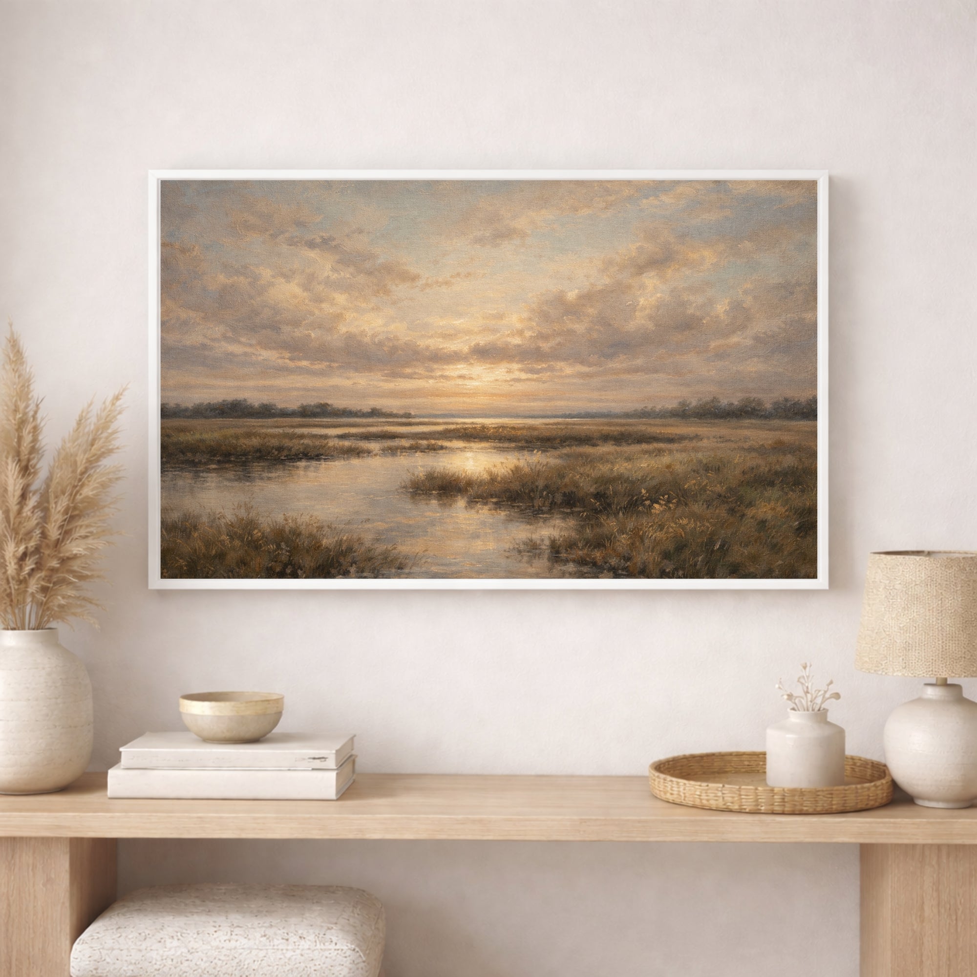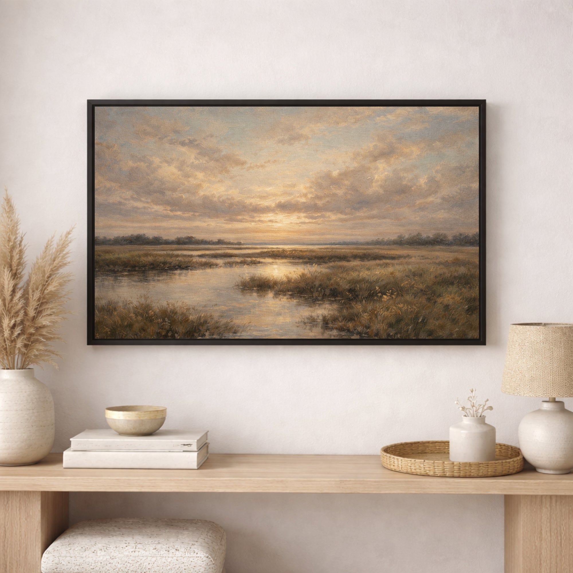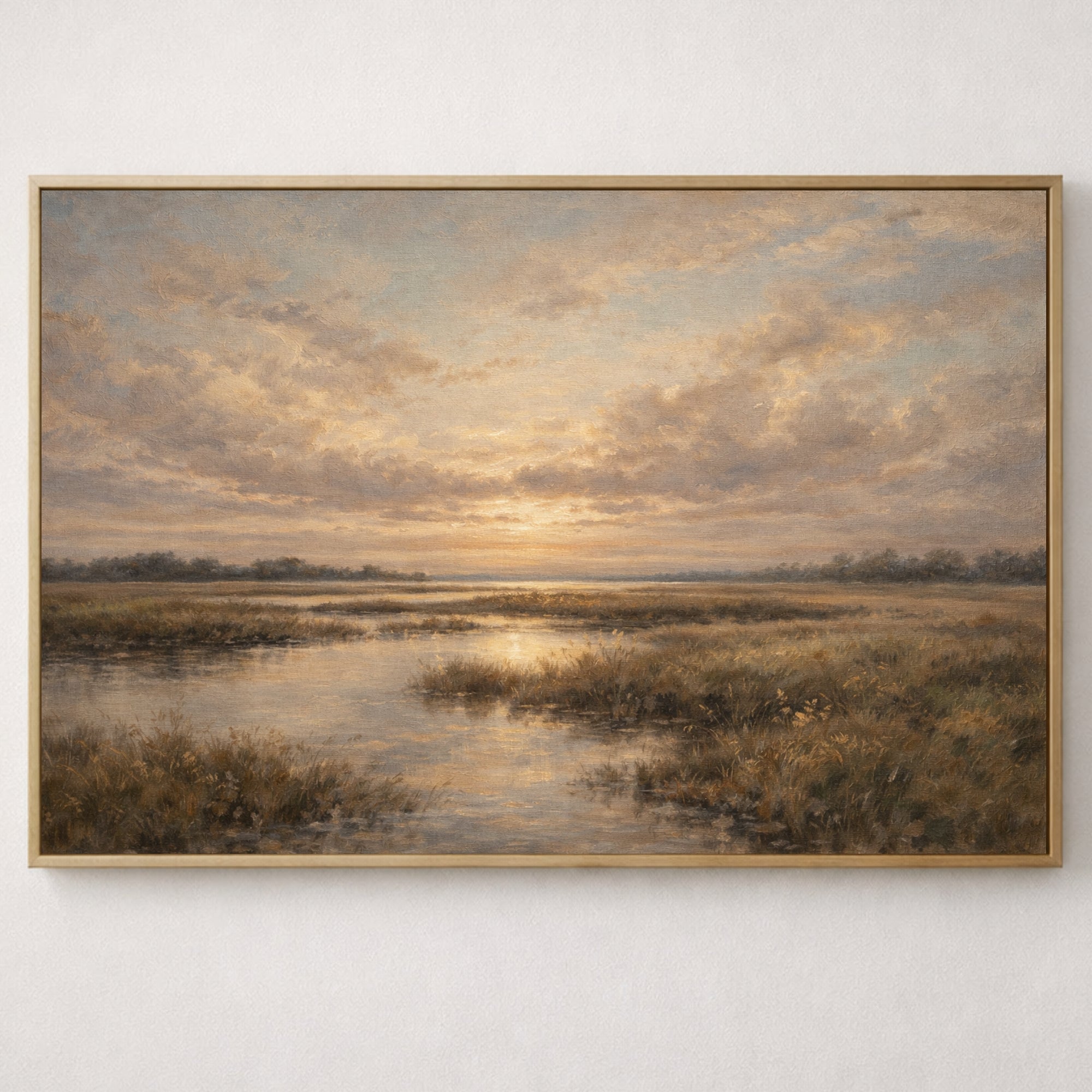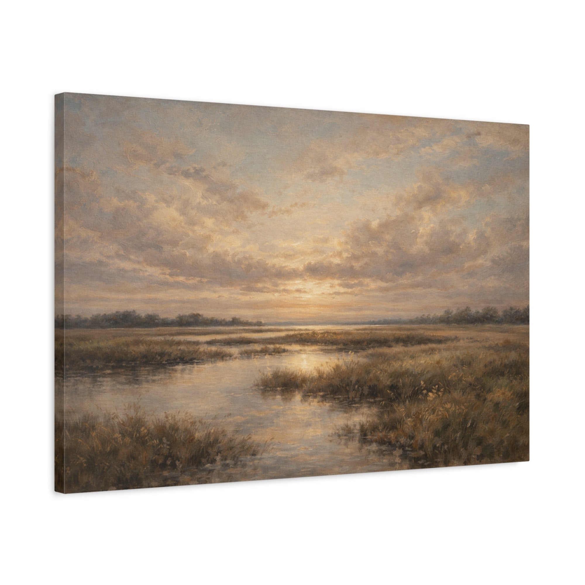 The glowing sunset reflection and gentle countryside setting bring a sense of stillness and warmth, making this piece ideal for creating a relaxing and welcoming atmosphere in your home.