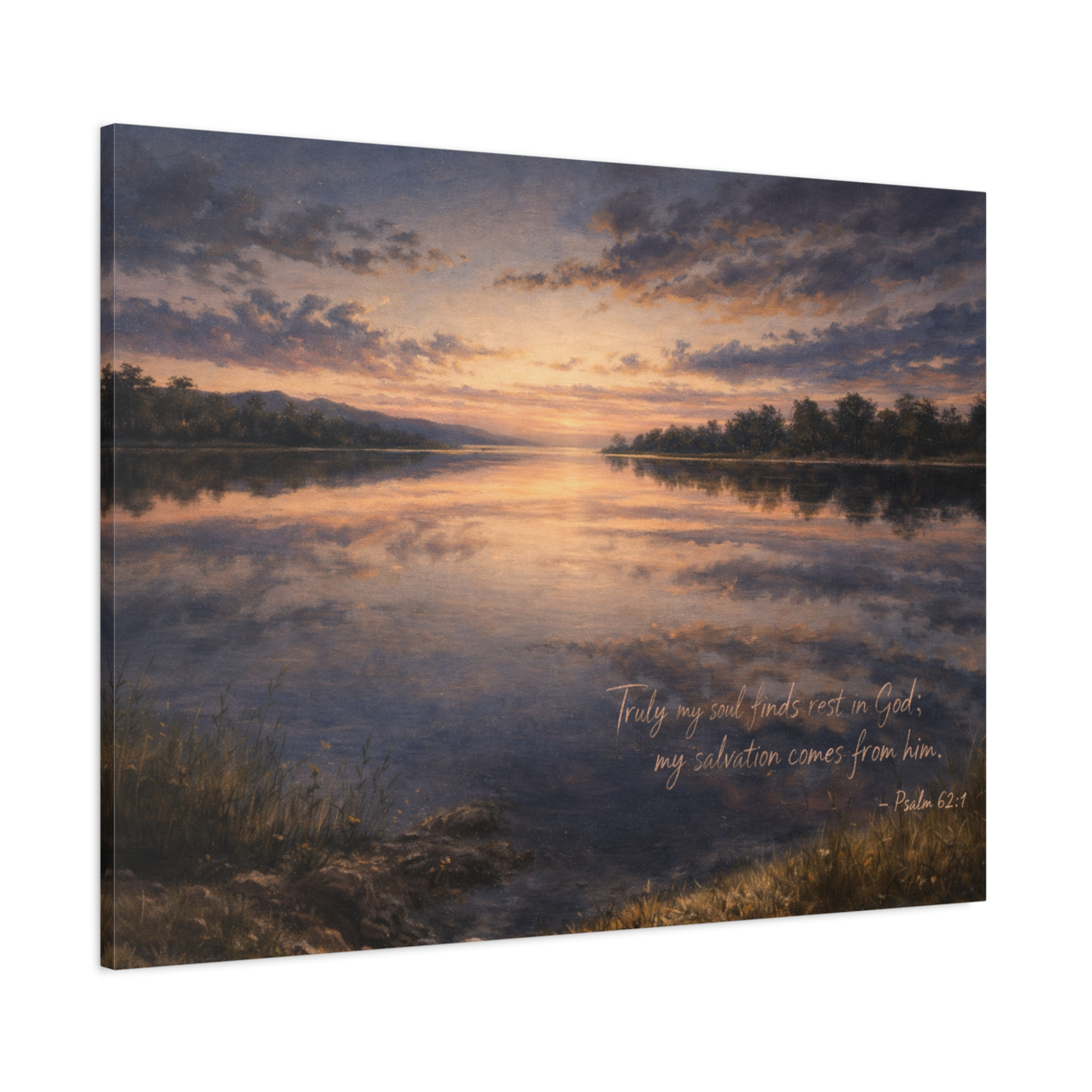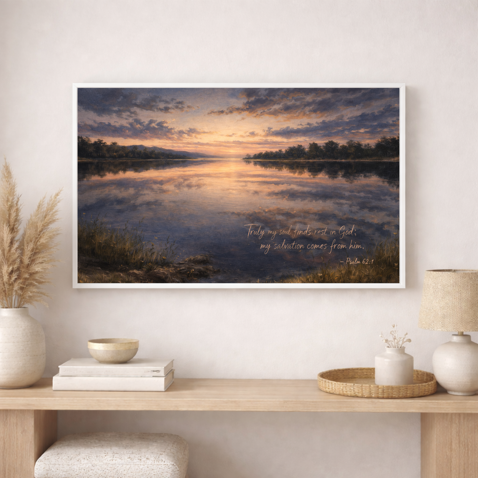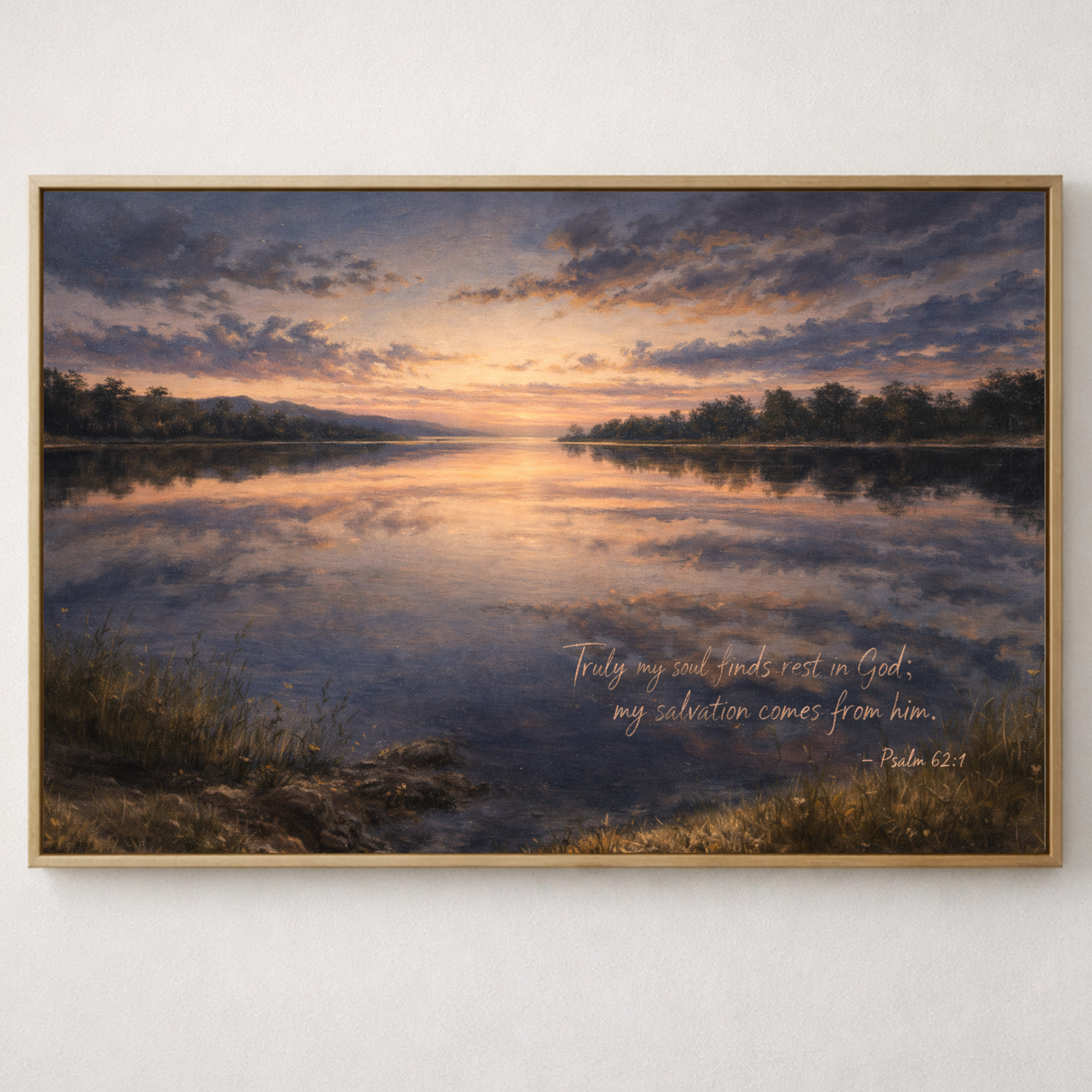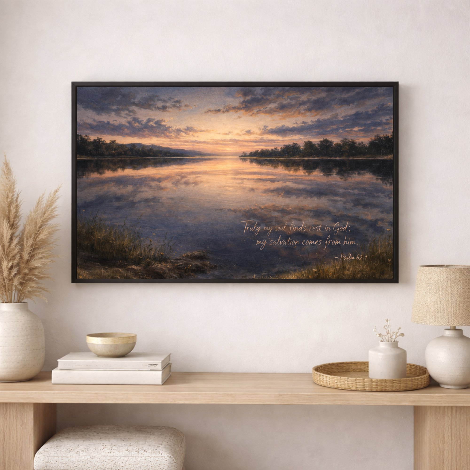 This peaceful Psalm 62:1 Christian wall art beautifully captures the stillness and comfort found in resting in God. A calm lake reflects the glowing colors of sunrise across the sky while distant trees and mountains fade softly along the horizon.